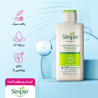 یکی از مزایای مهم آبرسان سیمپل مدل Rich برای پوست خشک، بافت سبک و جذب سریع آن است که بدون ایجاد چربی اضافی، رطوبت مورد نیاز پوست را تأمین میکند. اگر به دنبال محصولی ایمن و مؤثر هستید، محصولات سیمپل با کیفیت بالای خود، گزینهای ایدهآل برای مراقبت روزانه از پوست خشک و حساس شما خواهند بود