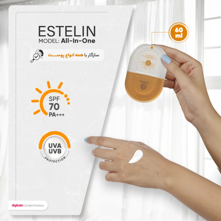 ضد آفتاب استلین برپایه آب و بسیار سبک میباشد. این ضد آفتاب بی رنگ، فاقد چربى و دارای SPF70 است. ضدآفتاب استلین در برابر اشعه UVA و UVB بسیار قوی عمل میکند و از تیرگی و آفتاب سوختگی جلوگیری میکند. ویتامین ث، نیاسینامید و هیالورونیک اسید موجود در کرم ضدآفتاب استلین، باعث درخشش و رطوبت رسانی عمیق پوست میشود. استفاده منظم روزانه از ضدآفتاب استلین میتواند پوست را در برابر اشعههای خورشید ایمن و از پیری زودرس، لک و تیرگی پوست جلوگیری کند.